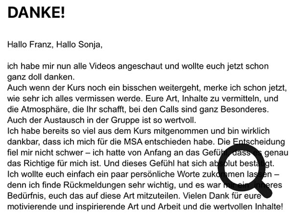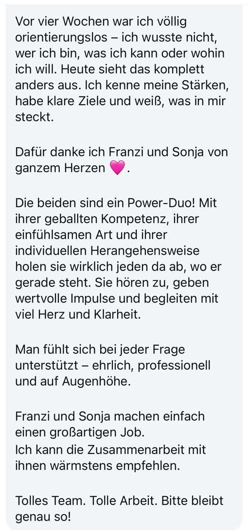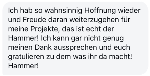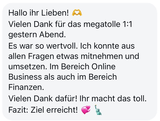 Die Bewertungen stammen von echten Kundinnen: Ehrlich, unbeeinflusst und aus eigener Erfahrung. Ihre Erfolge zeigen, was möglich ist, wenn du mit Klarheit, Mut und Umsetzungsstärke an dir, deinem Mindset & deinem Business arbeitest. Garantien geben wir keine, aber wir geben dir Tools, Strategien und Support, um wirklich etwas zu bewegen.