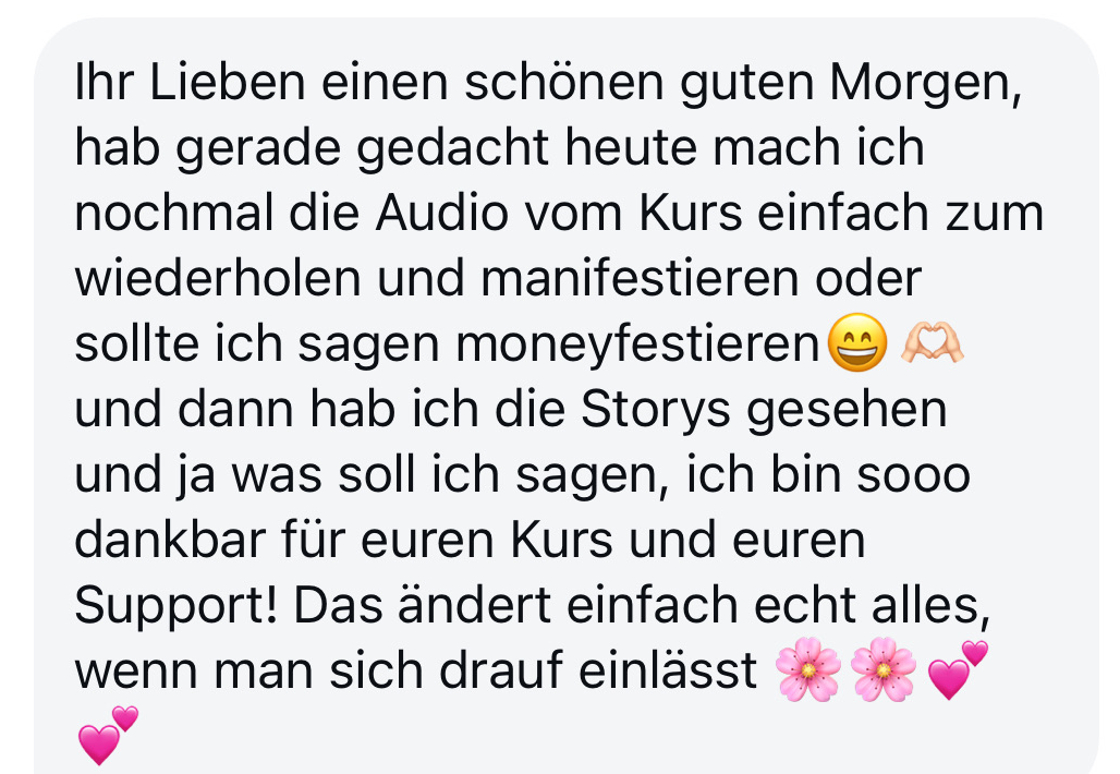 Heute lebe ich finanziell stabil, voller Fülle und Freiheit. Ich darf meine(n) Traumberuf(e) leben.