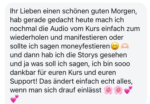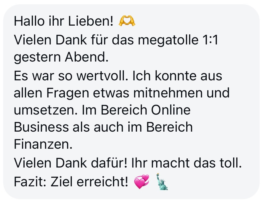 Die Bewertungen stammen von echten Kundinnen: Ehrlich, unbeeinflusst und aus eigener Erfahrung. Ihre Erfolge zeigen, was möglich ist, wenn du mit Klarheit, Mut und Umsetzungsstärke an dir, deinem Mindset & deinem Business arbeitest. Garantien geben wir keine, aber wir geben dir Tools, Strategien und Support, um wirklich etwas zu bewegen.